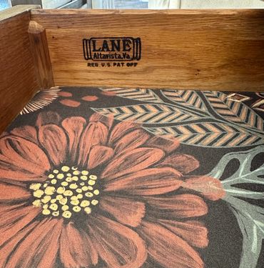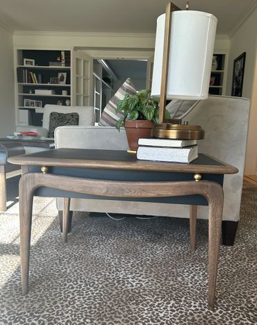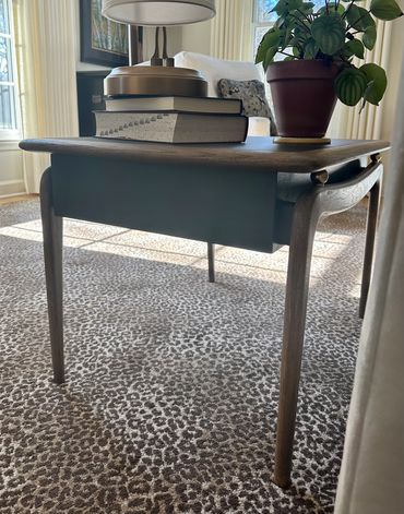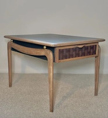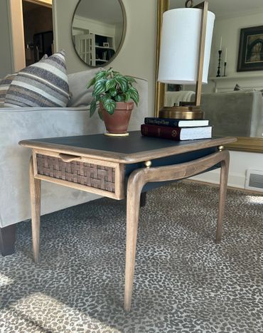 This Mid-Century Modern table has been both refurbished & refinished and can be used as a side table or a nightstand. The top and sides are painted in a charcoal color. The legs and top trim are stained in a light walnut bespoke mixture while the woven drawer front is stained a dark walnut. There is a Removable liner in the drawer.