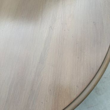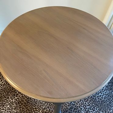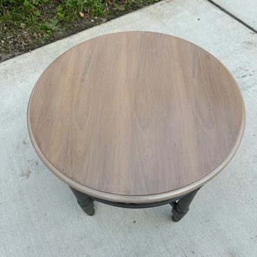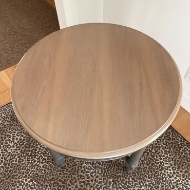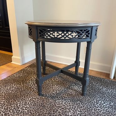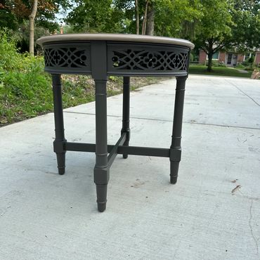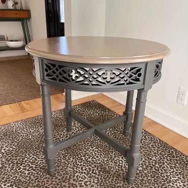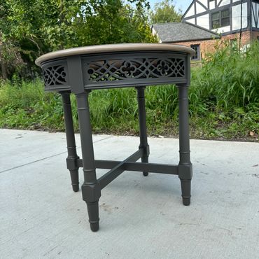 This solid wood side table is painted a neutral taupy-gray with the inside cut pattern hand-painted black for added depth. The wood top is paint-washed and sealed for a natural wood-toned appearance. Glass top is available for protection (not pictured) for additional $20